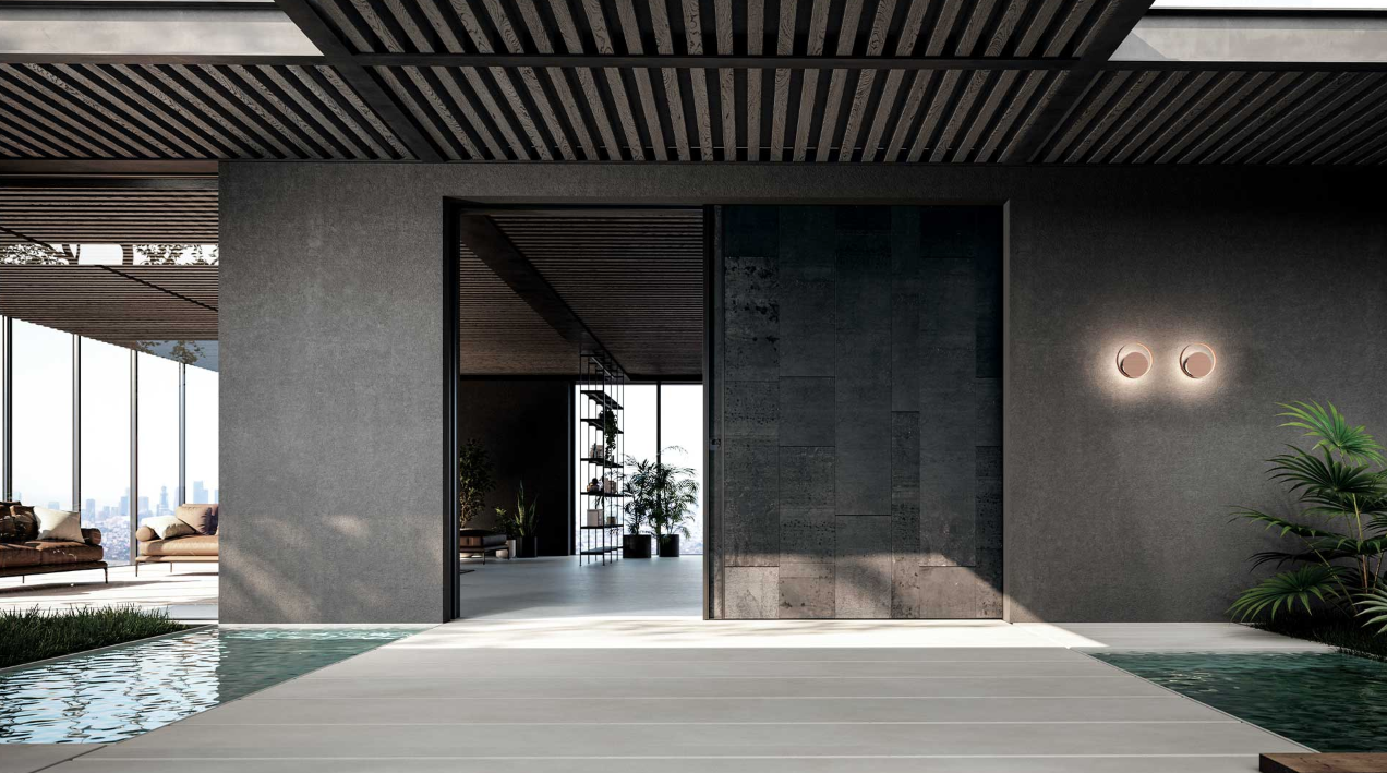 Porta blindata a bilico verticale, ideale per grandi aperture. Filomuro, personalizzabile, scenografica.